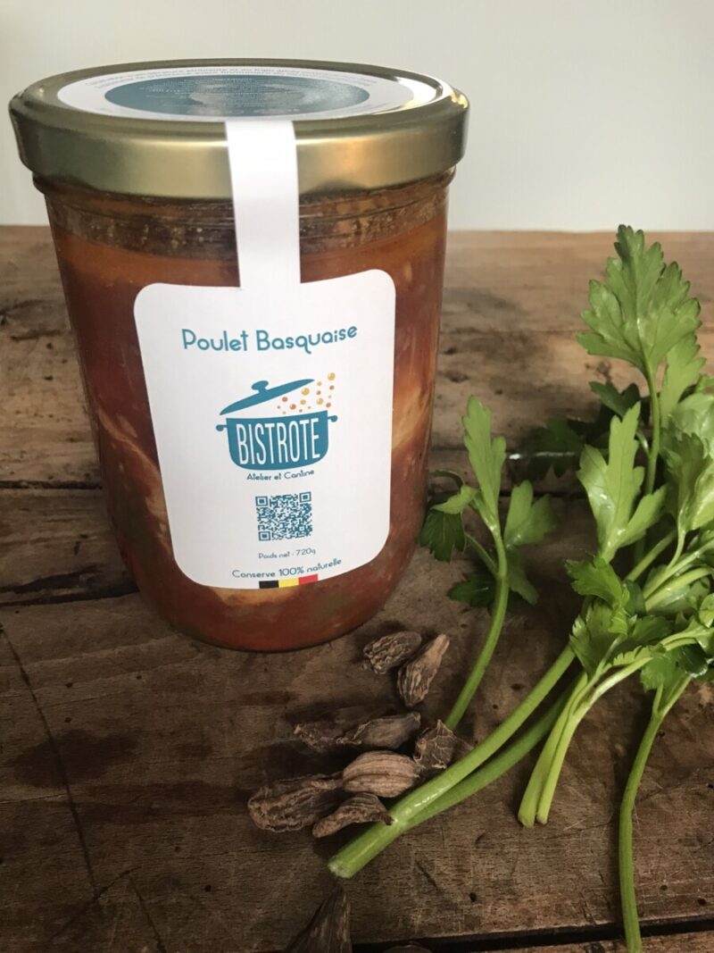 Poulet fermier, poivrons rouges, poivrons verts, pulpe de tomate (tomates, sel), oignons, bouillon de volaille (poulet, eau, oignons, carottes, CELERI, poireau, thym, laurier, poivre, huile d’olive, clou girofle), noix d’Ardennes (viande de porc, sel marin, épices), vin blanc (SULFITE), huile d’olive, ail, sel, piment d’Espelette